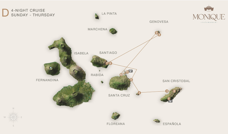 Upon arrival, you will be welcomed and assisted at the airport, then transferred from San Cristobal Airport to the M/C Monique.